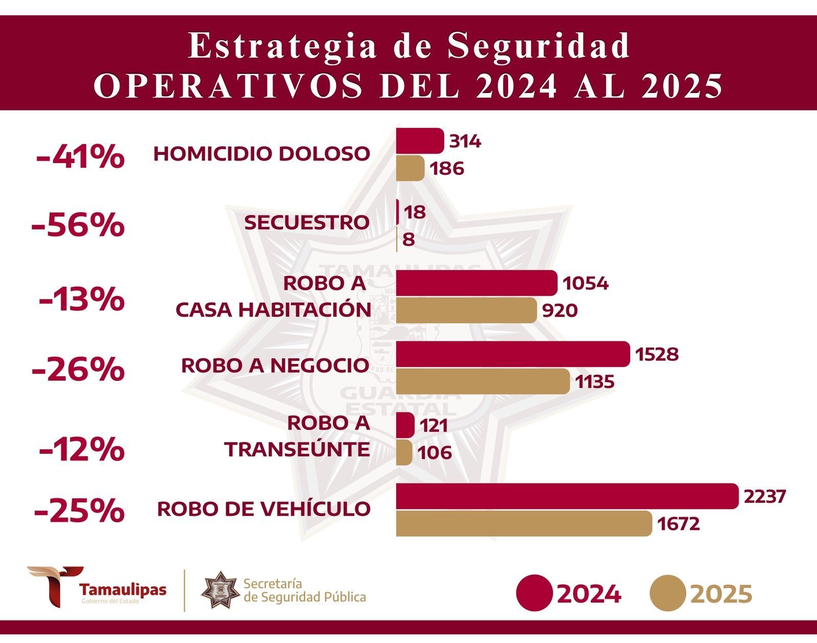 La estrategia de seguridad implementada en Tamaulipas durante el último año comienza a mostrar resultados; La Secretaría de Seguridad Pública del Estado (SSPT) reportó una baja generalizada en los principales delitos de alto impacto, destacando reducciones de hasta 56 por ciento, de acuerdo con cifras oficiales del periodo 2024-2025.