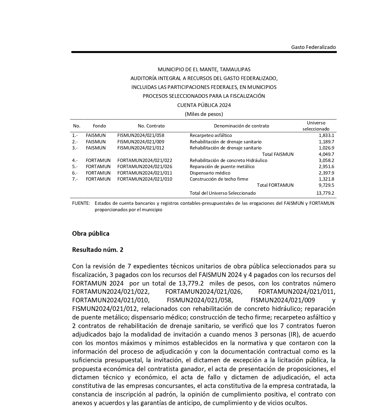 Entre los contratos observados se encuentra el FORTAMUN2024/021/011, correspondiente a un dispensario médico por 2 millones 397 mil 900 pesos, y el FORTAMUN2024/021/010, para la construcción de un techo firme por 1 millón 321 mil 800 pesos.