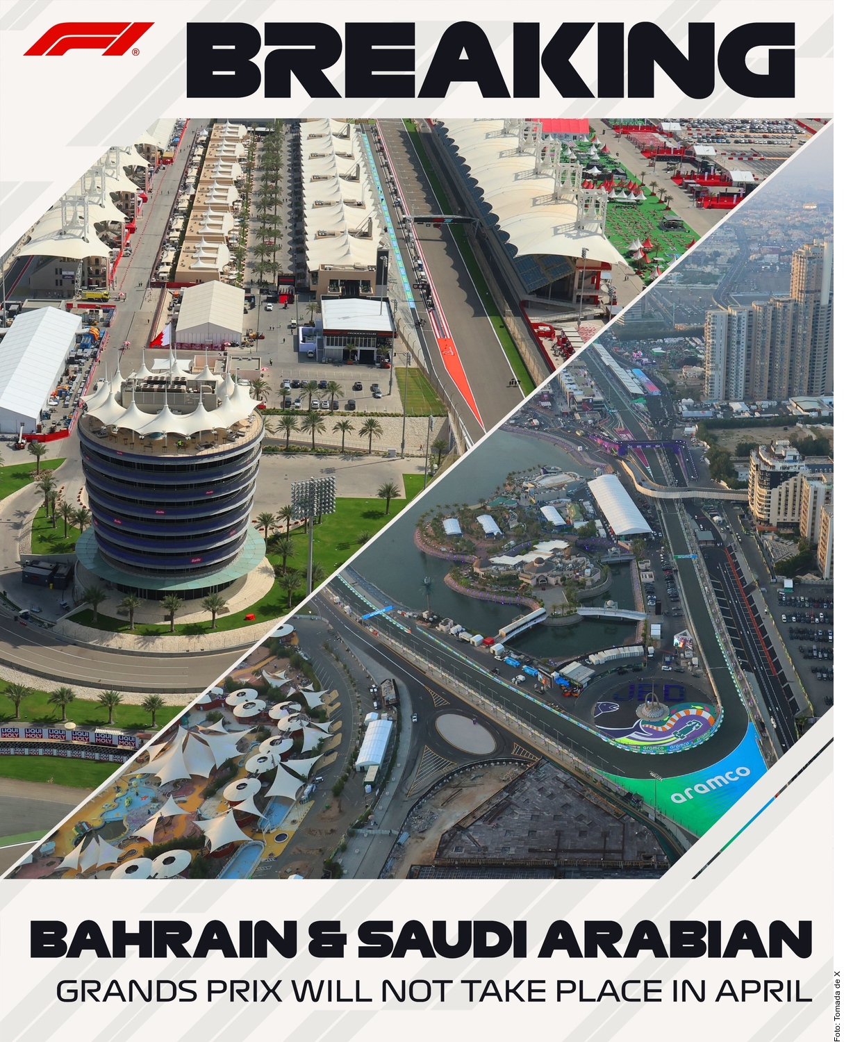 La Fórmula Uno canceló los Grandes Premios de Bahréin y Arabia Saudita debido a los riesgos derivados del conflicto armado en Medio Oriente; el calendario de la temporada se reduce de 24 a 22 carreras y se reanudará en mayo con el GP de Miami