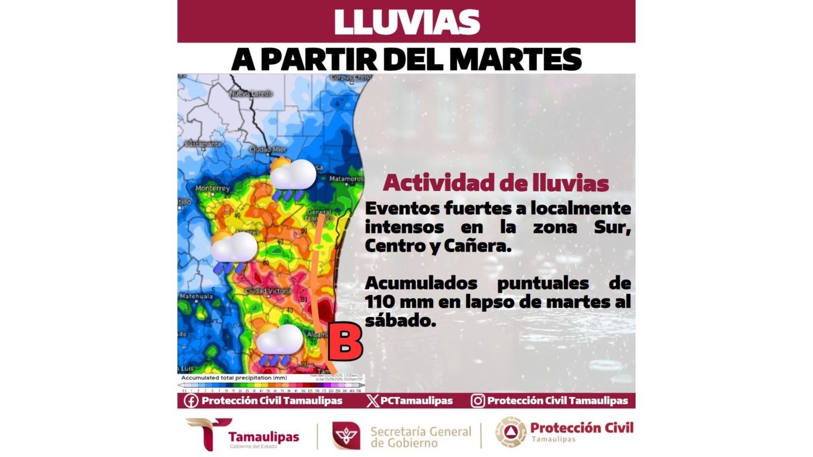 El pronóstico meteorológico indica que Tamaulipas enfrentará lluvias de diversa intensidad desde este martes y hasta el próximo viernes, con posibilidades de tormentas eléctricas y chubascos dispersos