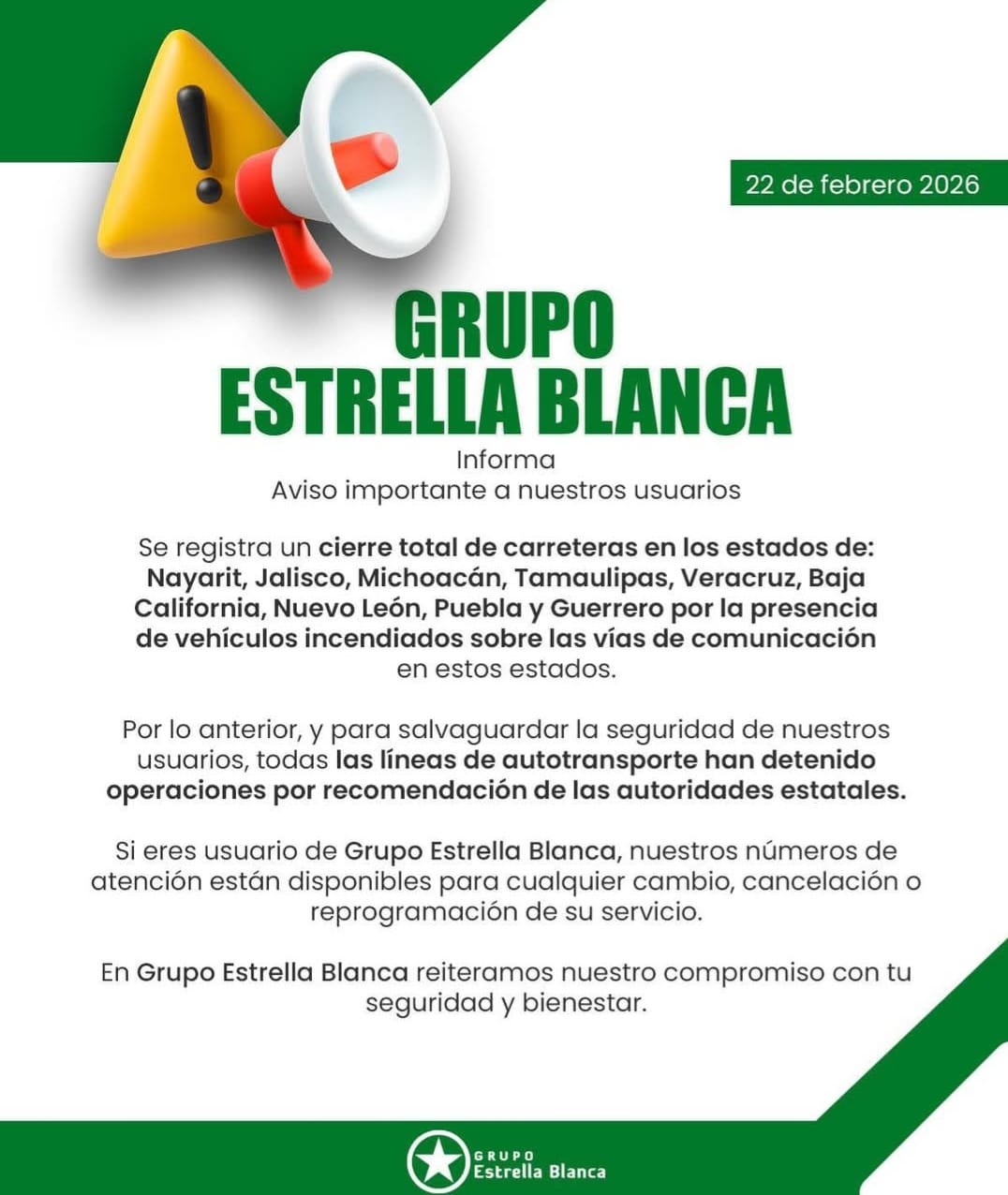Grupo Transpaís, Estrella Blanca y ETN informaron que esta determinación tiene un carácter estrictamente temporal y preventivo.