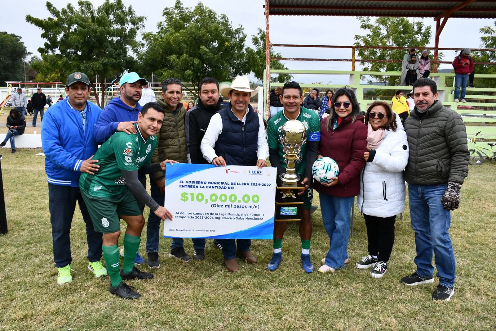 El alcalde de Llera, Moisés Borjon haciendo entrega del premio de 10 mil pesos al campeón León